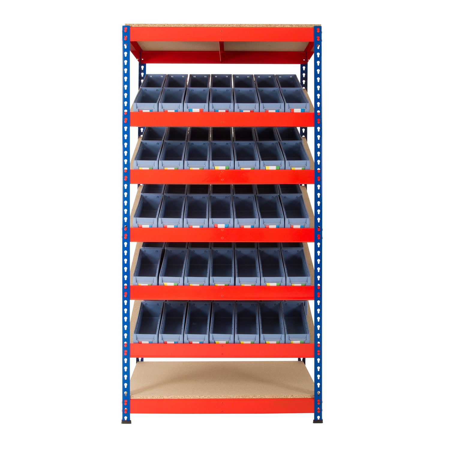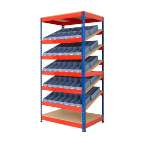 This range is available in several functional configurations, including complete systems supplied with picking bins, systems supplied with shelf trays, and open-frame shelving with sloping shelves only. All variations share a standard footprint of 1830 mm height × 915 mm width × 610 mm depth, providing a uniform structure that fits easily into production lines, packing cells, and kitting areas. Users can also add extra sloping shelves to expand capacity or reconfigure layouts for different product sizes.