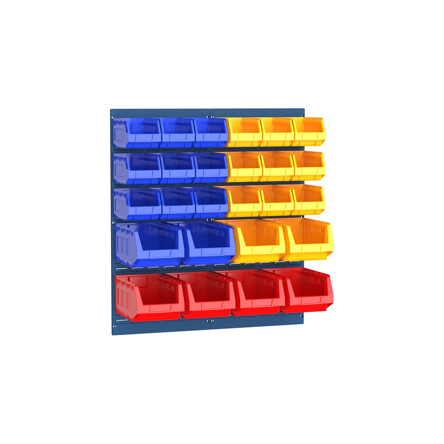 The vertical panel design is ideal for compact or busy work areas, maximizing wall space and keeping work surfaces clear. Available in multiple configurations, from 2 × 0.5 m panels with 32 bins to 3 × 1.5 m panels with 87 bins, this kit offers scalable storage capacity suitable for both small workshops and large production lines.